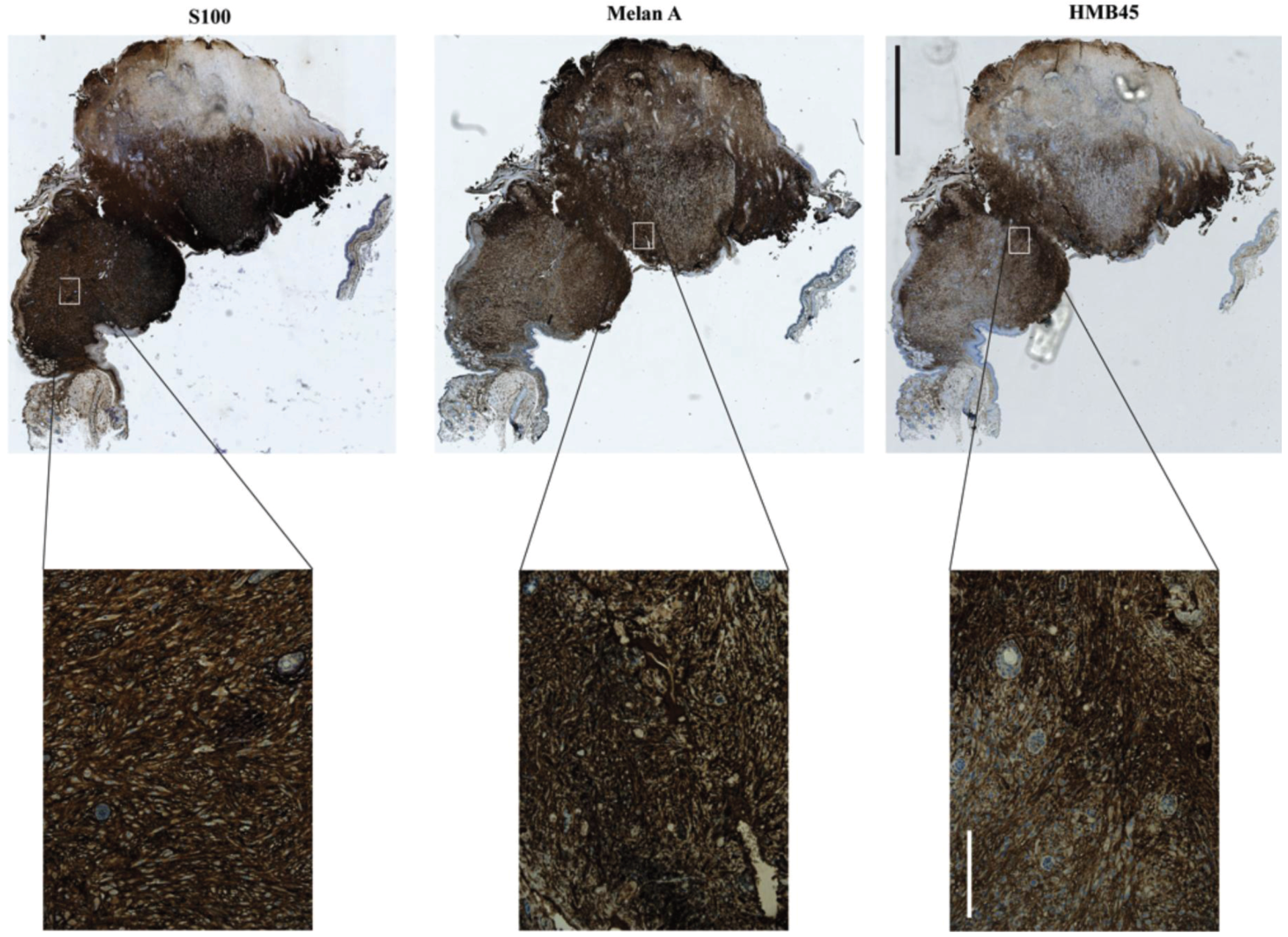 Spontaneous melanoma, which manifested on the ear of a UVB irradiated Cdkn2a−/−, Tyr-HRAS mouse. Staining positivity for all three markers (S100, Melan A and HMB45) as well as their pattern and localization are indicative of melanoma. Scale bars are 2 mm for the low (5×) and 200 μm for the high magnification (20×) images.