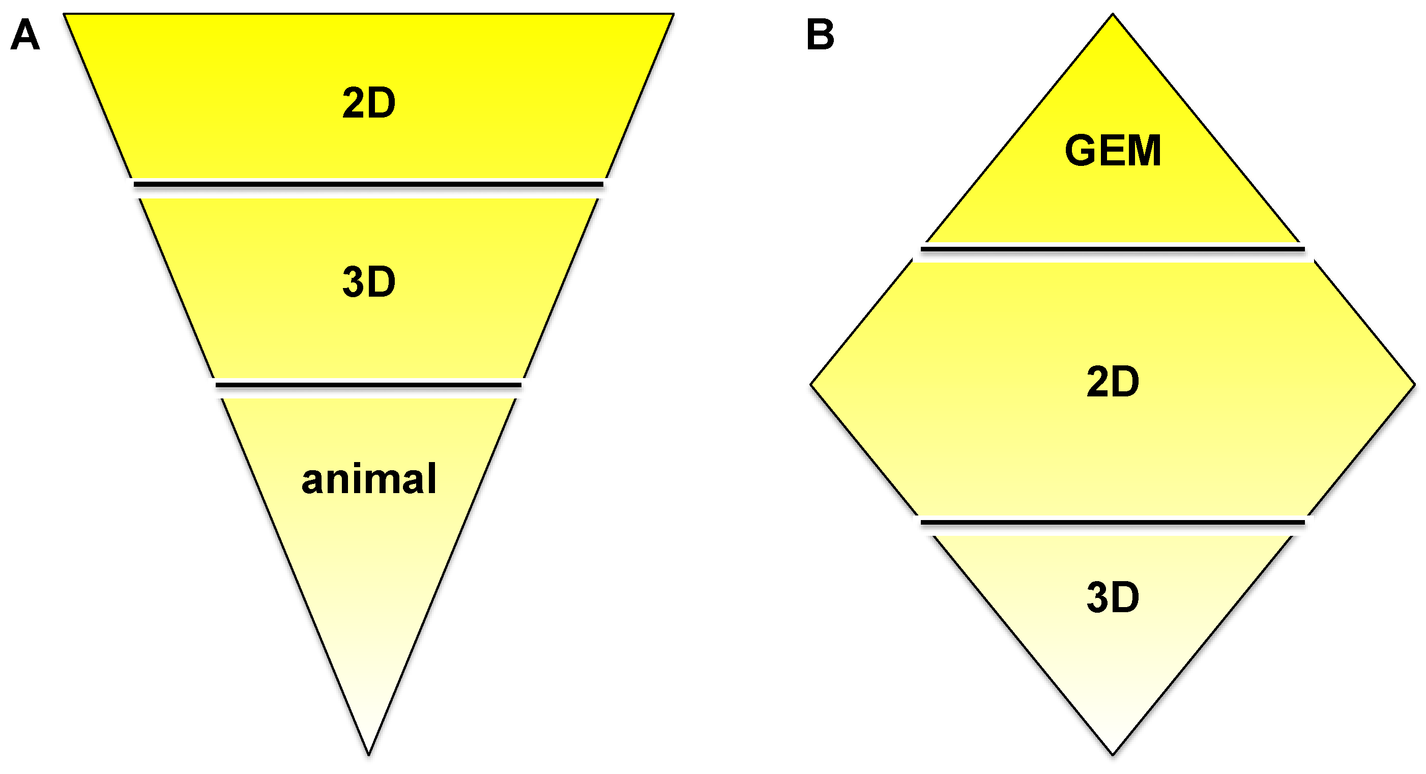 In order to accommodate all claims listed in the introduction—to recreate tumor progression, migration, invasion, its interaction with the microenvironment, drug delivery and bioavailability, but also ease of use and cost—we suggest a combination of multiple models as outlined in Figure 7. The ‘upside-down triangle approach’ (Figure 7A) is often used to perform drug discovery/development studies: Initial high-throughput screening in 2D culture using a high number of cell lines or primary cells and/or compounds or drug combinations. From the 2D experiments certain conditions of interest may be chosen for the next step, a semi-high-throughput screen in 3D culture. Based on data generated in 3D models, the final step should be the appropriate animal experiments. In vitro pre-screening should lead to the involvement of significantly fewer animals and therefore should provide a cost- and time-effective as well as ethically acceptable approach. An alternative is the ‘diamond approach’, in which cell lines can be isolated from a tumor growing in a GEM and characterized in 2D and then 3D culture. Similarly, either approach can be applied for mechanistic studies. The decision on which approach to apply may be guided by the pros and cons discussed in this review.