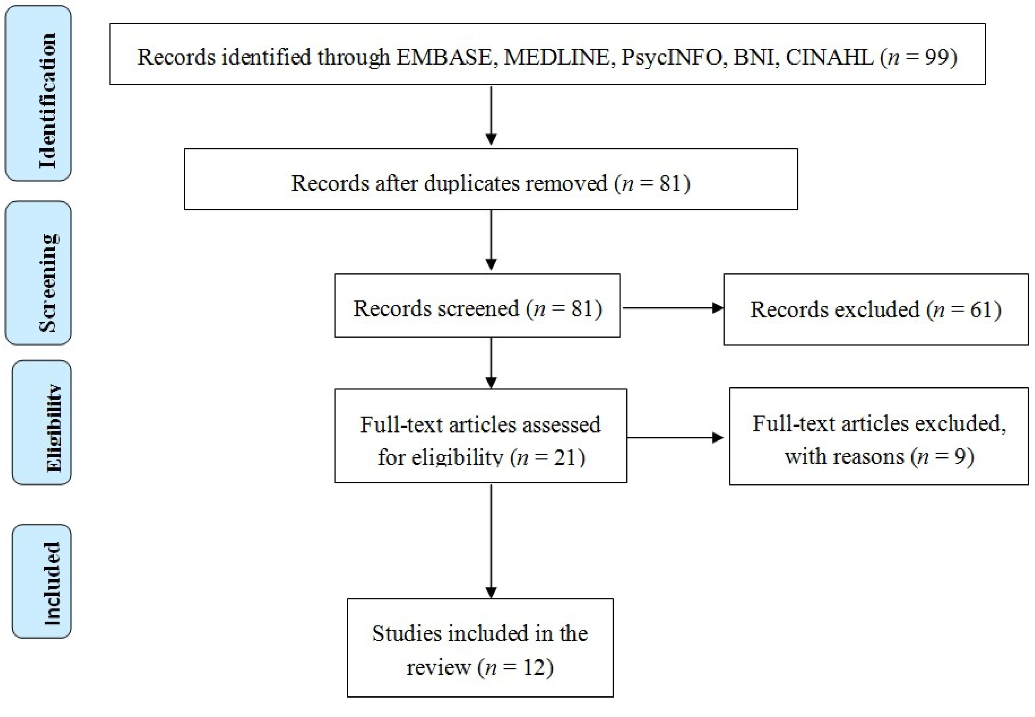 The search yielded 99 results. Of these 99, 19 were duplicates. Following a review of all abstracts 61 were excluded as they did not meet the inclusion criteria leaving a total of 21 papers for review. Two authors (KO and KE) reviewed all papers (see Figure 1). The figure is presented in a PRISMA (Preferred Reporting Items for Systematic Reviews and Meta-Analyses) [22]. No articles were identified that met the criteria of examining resilience in patients who are living with a wound, a notable gap in the evidence base. Of the reviewed articles, 12 were considered for inclusion in this review that examined instead the experiences or the psychological impact of living with a wound, with others excluded or included with reasons provided (see Table 1).