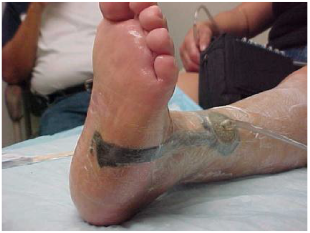 - Armstrong, D.G.; Nguyen, H.C.; Lavery, L.A.; van Schie, C.H.; Boulton, A.J.; Harkless, L.B. Offloading the diabetic foot wound: A randomized clinical trial. Diabetes Care 2001, 24, 1019–1022. [Google Scholar] [CrossRef] [PubMed]