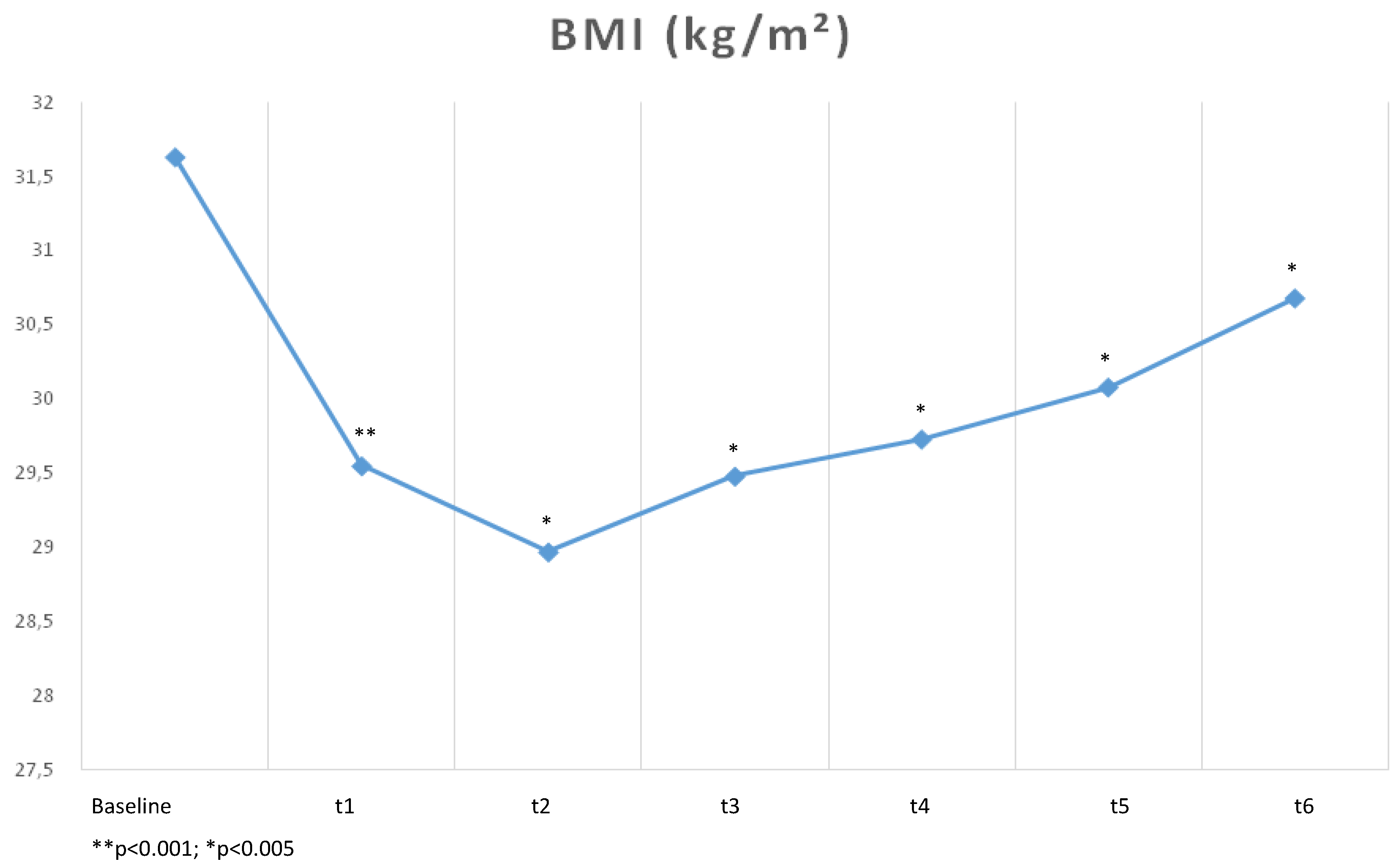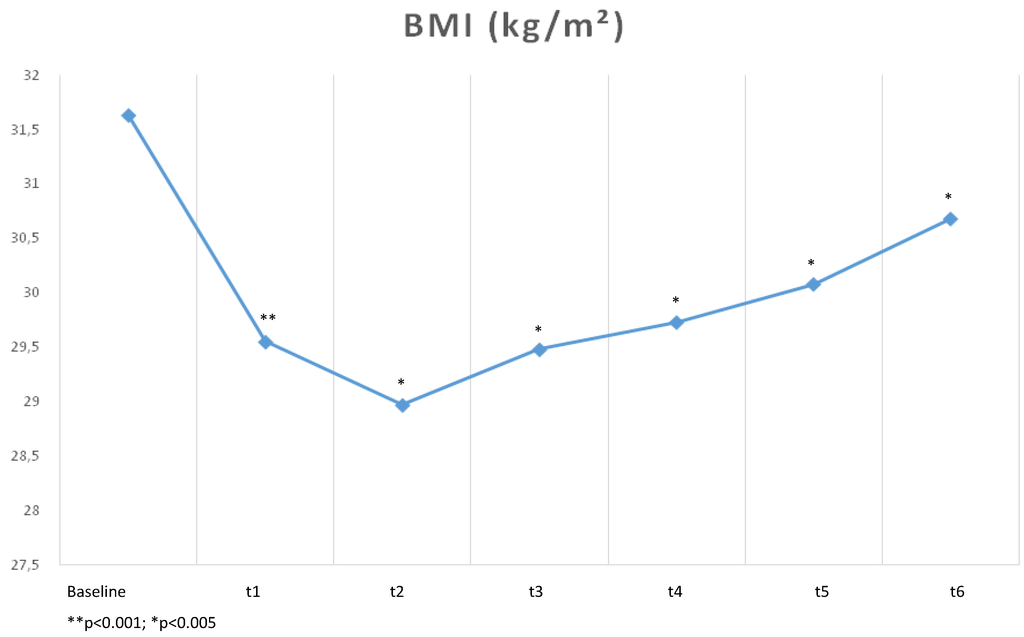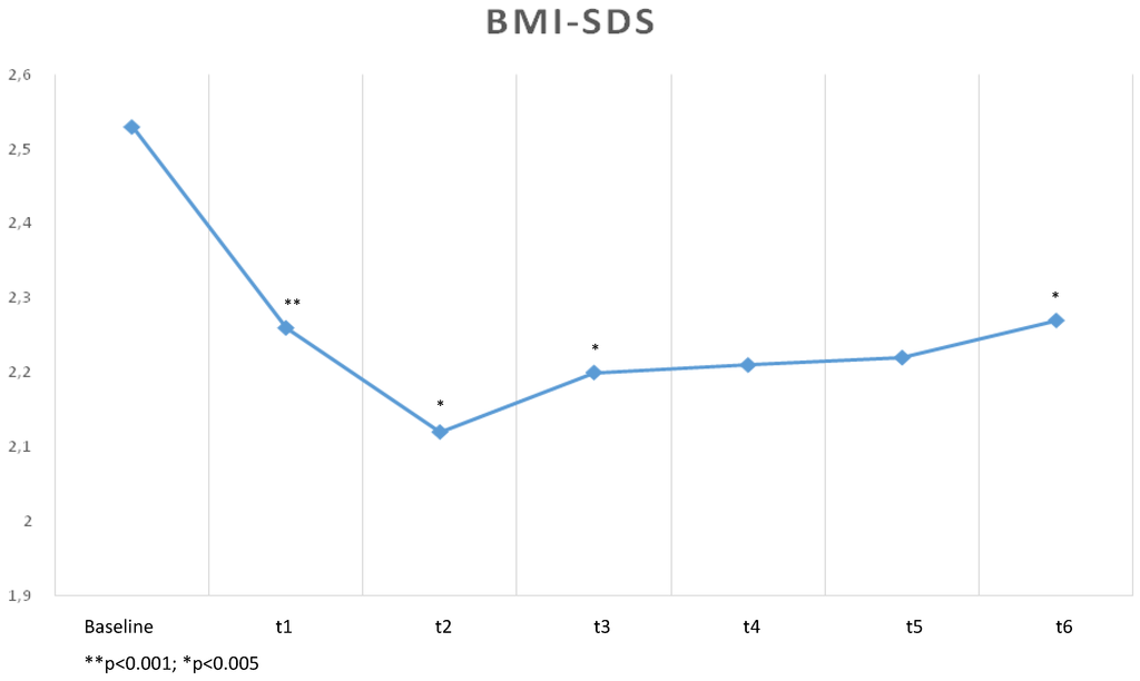 Until the end of the trial (t6), BMI and BMI-SDS showed a slight increase, but both were significantly lower in comparison to baseline (t0) (Figure 1 and Figure 2).