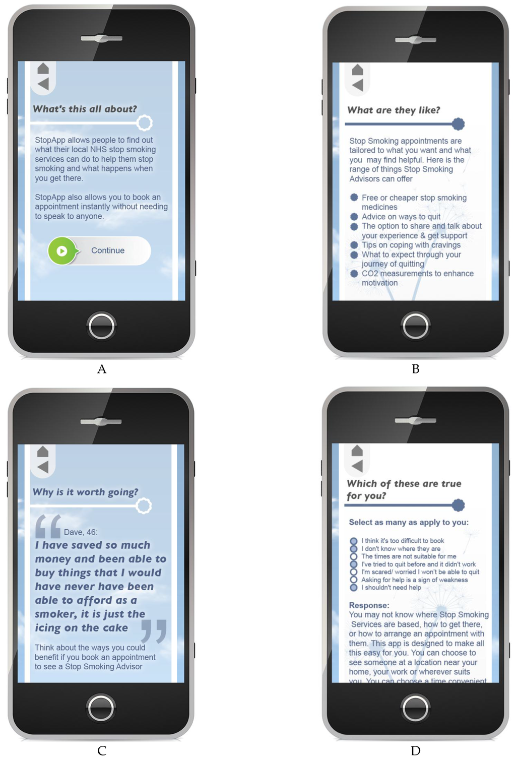 StopApp is a novel theory-driven and evidence-based intervention that aims to increase referrals to and attendance at SSS. Secondary outcomes may include increased four-week quit rates. It includes a brief evidence-based behaviour change intervention designed to increase motivation to book and attend SSS, including the facility to instantly book an appointment, providing opportunity when motivation is increased and reminders to attend. Recent research suggests that smokers who reported higher motivation to quit on attending SSS had the highest quit rates; this was not influenced by gender or level of deprivation, which suggests the importance of motivation as a driver of behaviour change []. Reducing wasted appointments and administrative time relating to arranging and booking appointments could lead to significant cost savings. More smokers setting a quit date and ultimately stopping smoking will undoubtedly carry significant cost savings in terms of healthcare utilization.