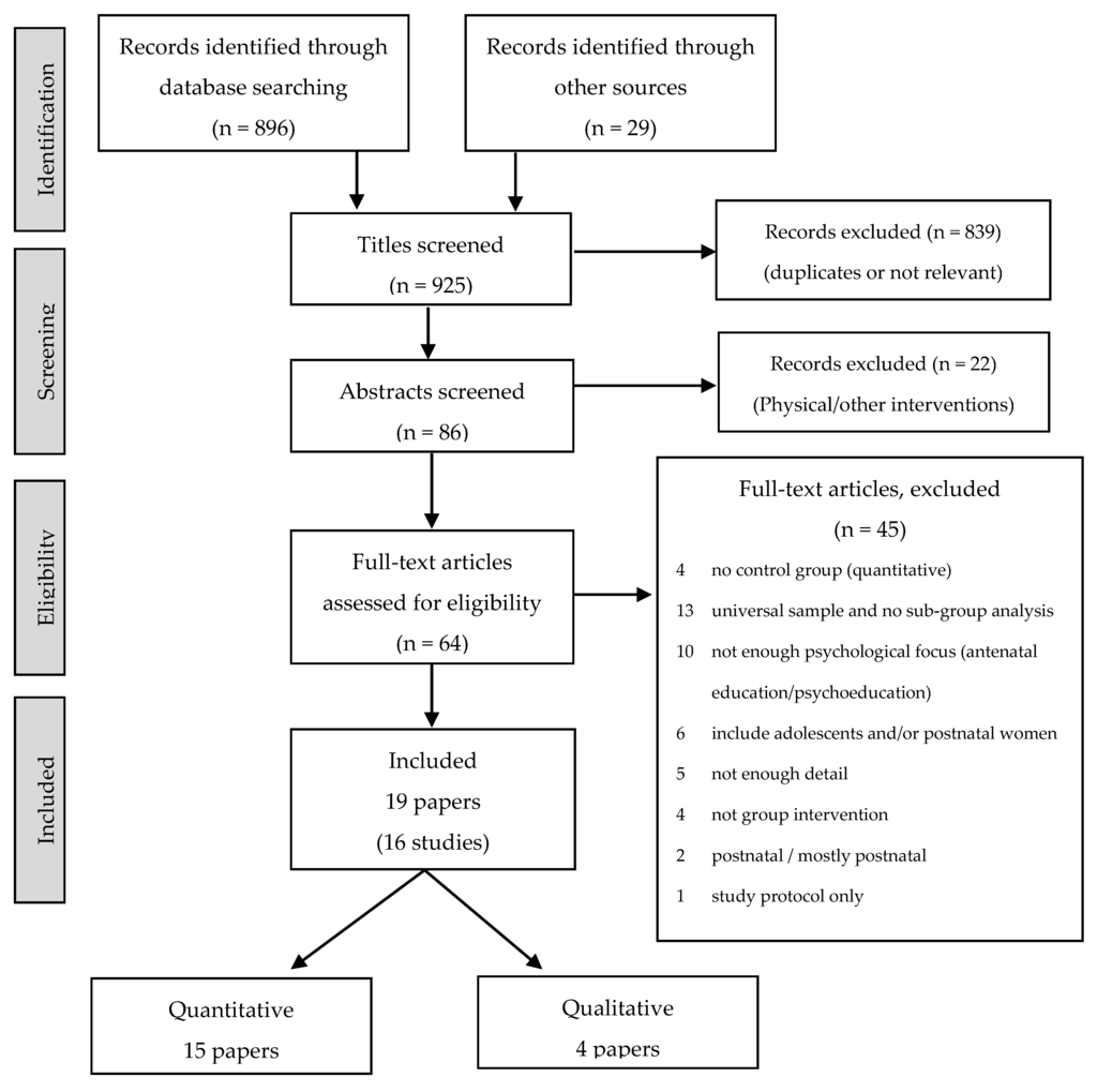 Research has shown that perinatal vulnerability to PND begins before birth [,,]. There is considerable literature on risk factors and neonatal and obstetric outcomes for perinatal mental illness (PMI). In view of its prevalence and potentially significant consequences, there has been growing interest in identifying antenatal interventions which facilitate the process of preventing or managing PMI and/or optimising psychological well-being before and after women give birth. These antenatal interventions vary widely in their approach, including antenatal education, physical activities, and interventions with a psychological focus. The focus of this review will be on interventions which use a psychological approach with a clear theoretical underpinning and evidence of effectiveness in other clinical areas. More specifically, the focus will be on group interventions, as these have pragmatic advantages and the potential to reach a large number of women, as well as providing an element of peer support, which an increasing body of evidence suggests has some demonstrable benefits [,,,,,].