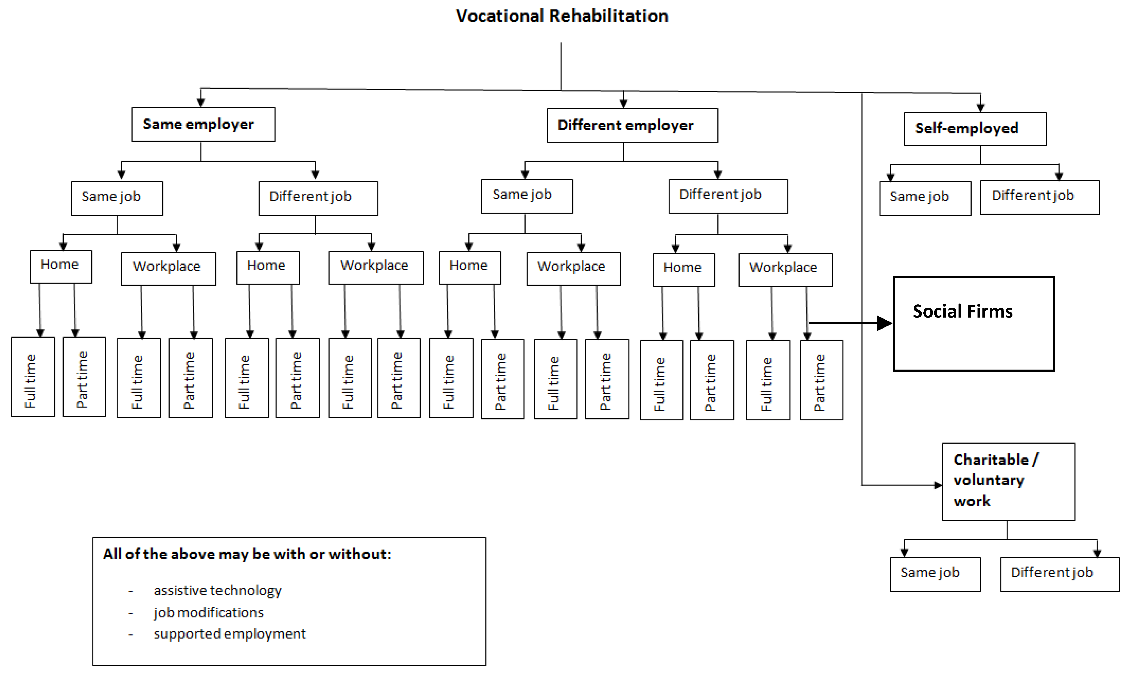 Vocational professionals have an important and sometimes critical role to play in the RTW process. These professionals go under a variety of names, e.g., vocational therapists/consultants/case coordinators/counsellors (VTs) [11,56,93,98,121], or sometimes return to work coordinators [89,122]. Their prime functions include matching the abilities and aspiration of the client with the demands of employment [36,60,93,98]. They may arrange work with local employers [60] or with the voluntary sector [37]. This may lead to more formal work trials [11,44,60]. Worksite visits are usually important in facilitating a RTW [56,59,98,99] and may involve training at the worksite [11,60,98,121]. Such visits greatly facilitate the introduction of job modifications (accommodations). Since all these interventions demand the active involvement of the employer, the employer is now considered part of the rehabilitation process [59].