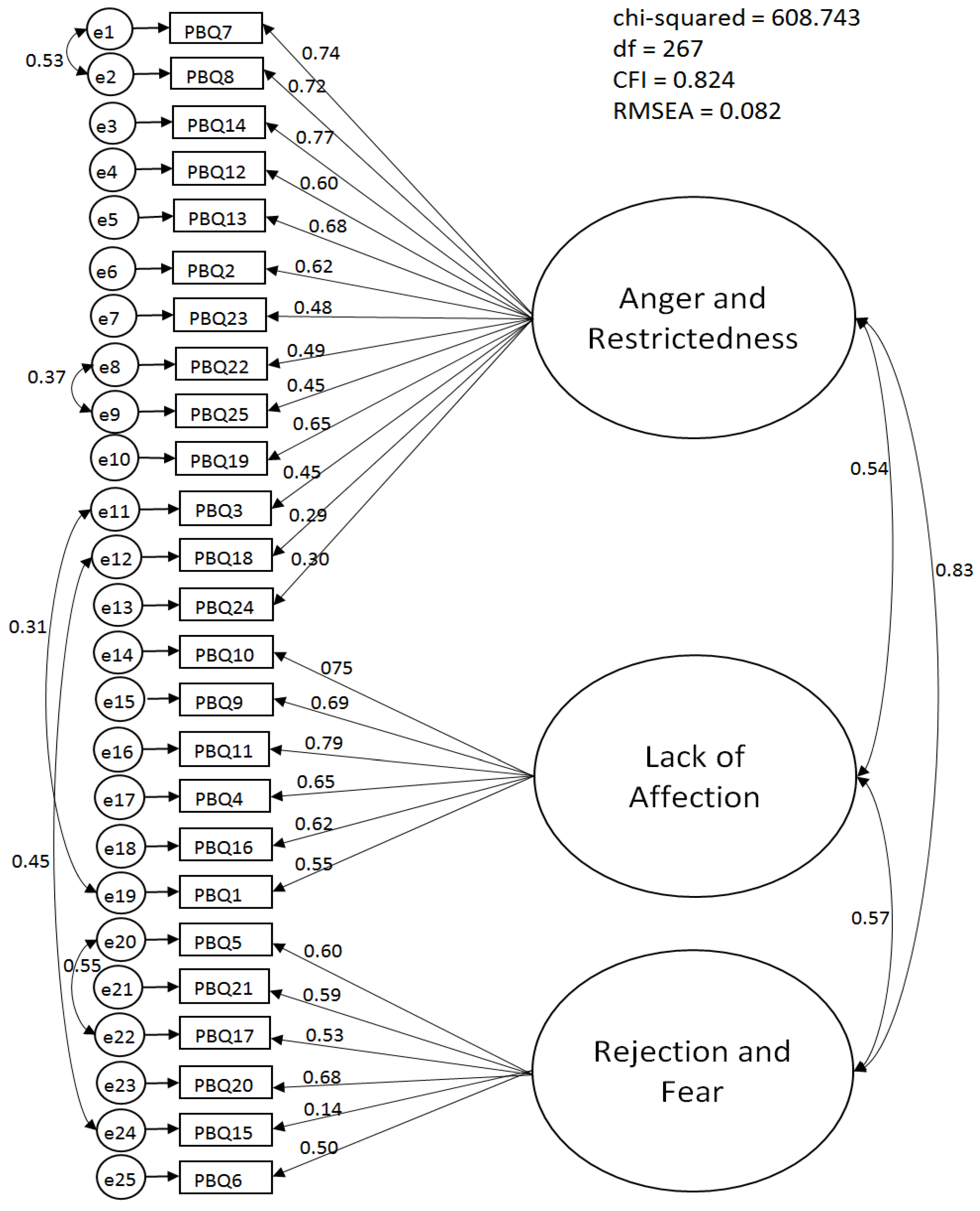 Modification indices suggested covariances between some of the error variables. Adding these covariances, we obtained a final model with better indices of fit: CMIN/df = 2.28, CFI = 0.82, and RMSEA = 0.08 (Figure 1). All the coefficients of paths from the latent variable were statistically significant, except for item 15 (standardized path coefficient = 0.14). The three latent variables were significantly correlated with each other: Anger and Restrictedness and Lack of Affection, r = 0.54; Anger and Restrictedness and Rejection and Fear, r = 0.83; and Lack of Affection and Rejection and Fear, r = 0.57.
