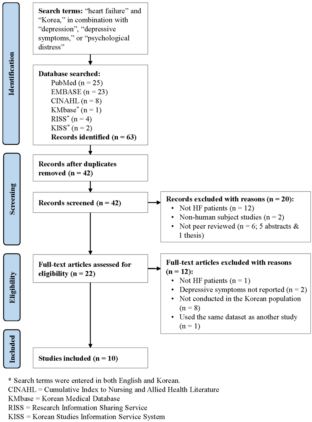 Following the integrative review methodology outlined by Whittemore and Knafl [12], a search was conducted to identify relevant articles published by 12 February 2016. The following electronic databases were used: PubMed, EMBASE, Cumulative Index to Nursing and Allied Health Literature (CINAHL), Korean Medical Database (KMbase), Research Information Sharing Service (RISS), and Korean Studies Information Service System (KISS). Search terms included “heart failure” and “Korea”, in combination with each of the following search terms: “depression”, “depressive symptoms”, or “psychological distress”. For the following databases, terms were entered in both English and Korean: KMbase, RISS, and KISS. The two authors (B.H. and H.C.) independently screened publications using the following inclusion criteria: (1) reporting depressive symptoms of patients with HF in Korea; (2) peer-reviewed; and (3) published in either English or Korean. In addition, all studies were required to report depressive symptoms in a sample composed exclusively of patients diagnosed with HF or report depressive symptoms specifically for a subgroup of patients with HF. The two authors independently extracted data on the following study characteristics from each study: study design, sample characteristics (e.g., age, gender, severity of HF), recruitment setting characteristics (i.e., in-patient vs. out-patient settings), assessment methods of depression, and main findings (e.g., prevalence of depression). To ensure data accuracy, data were rechecked against the original articles. The authors discussed any discrepancies until an agreement was reached.