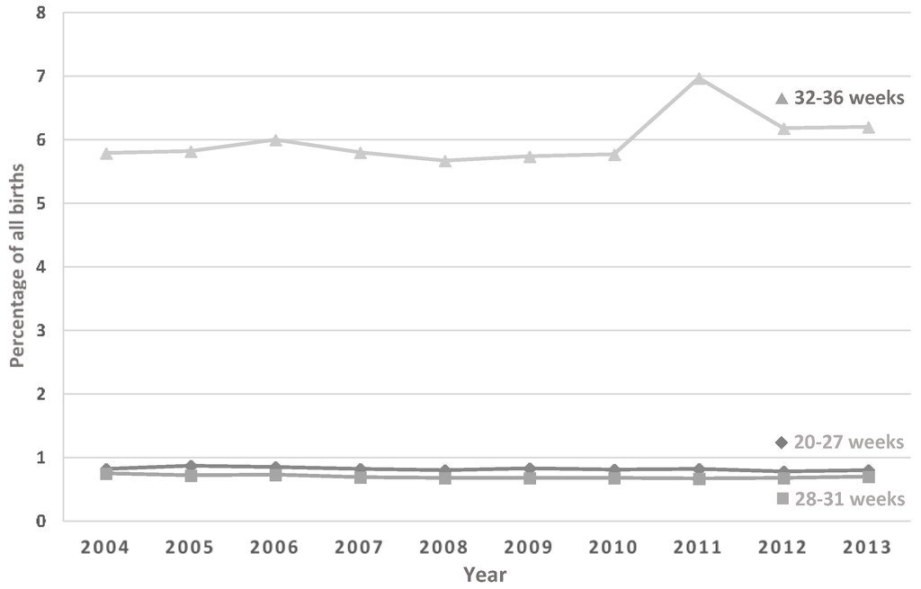 Preterm births as a percentage of all births in Australia, 2004 to 2013. There have been slight but significant increases in the percentage of preterm births in the 20–27 week group (R = 0.68; aR2 = 0.47; p = 0.03) and 28–31 week group (R = 0.73; aR2 = 0.48; p = 0.02) but no change in the 32–36 week group (R = 0.52; aR2 = 0.18; p = 0.12). From AIHW Australia’s Mothers and Babies series.