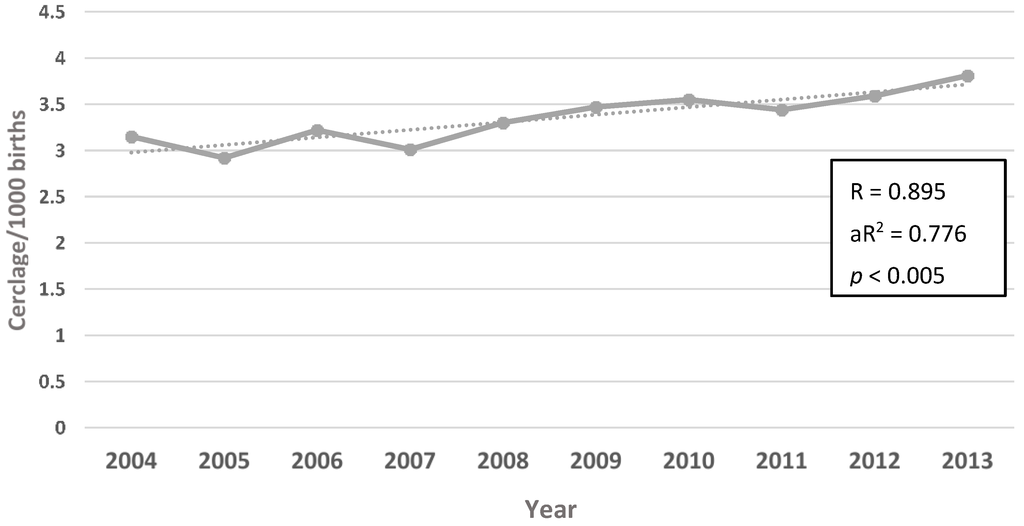 Overall incidence rate of cervical cerclage (procedures per 1000 births) in Australia for the period 2004 until 2013.