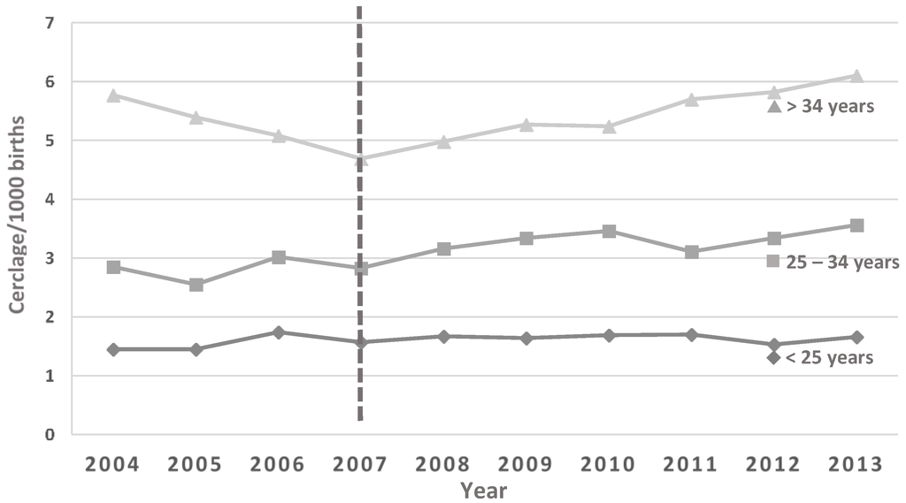 Maternal age-stratified incidence rates for cervical cerclage (procedures per 1000 births) in Australia for the period 2004 until 2013. There was no increase in the rate of cerclage in the age group less than 25 years across the study period (R = 0.46; aR2 = 0.11; p = 0.19), but significant increases since 2007 in the 25 to 34 year age group (R = 0.84; aR2 = 0.67; p = 0.002) and the 35 years and older age group (R = 0.99; aR2 = 0.96; p < 0.005).