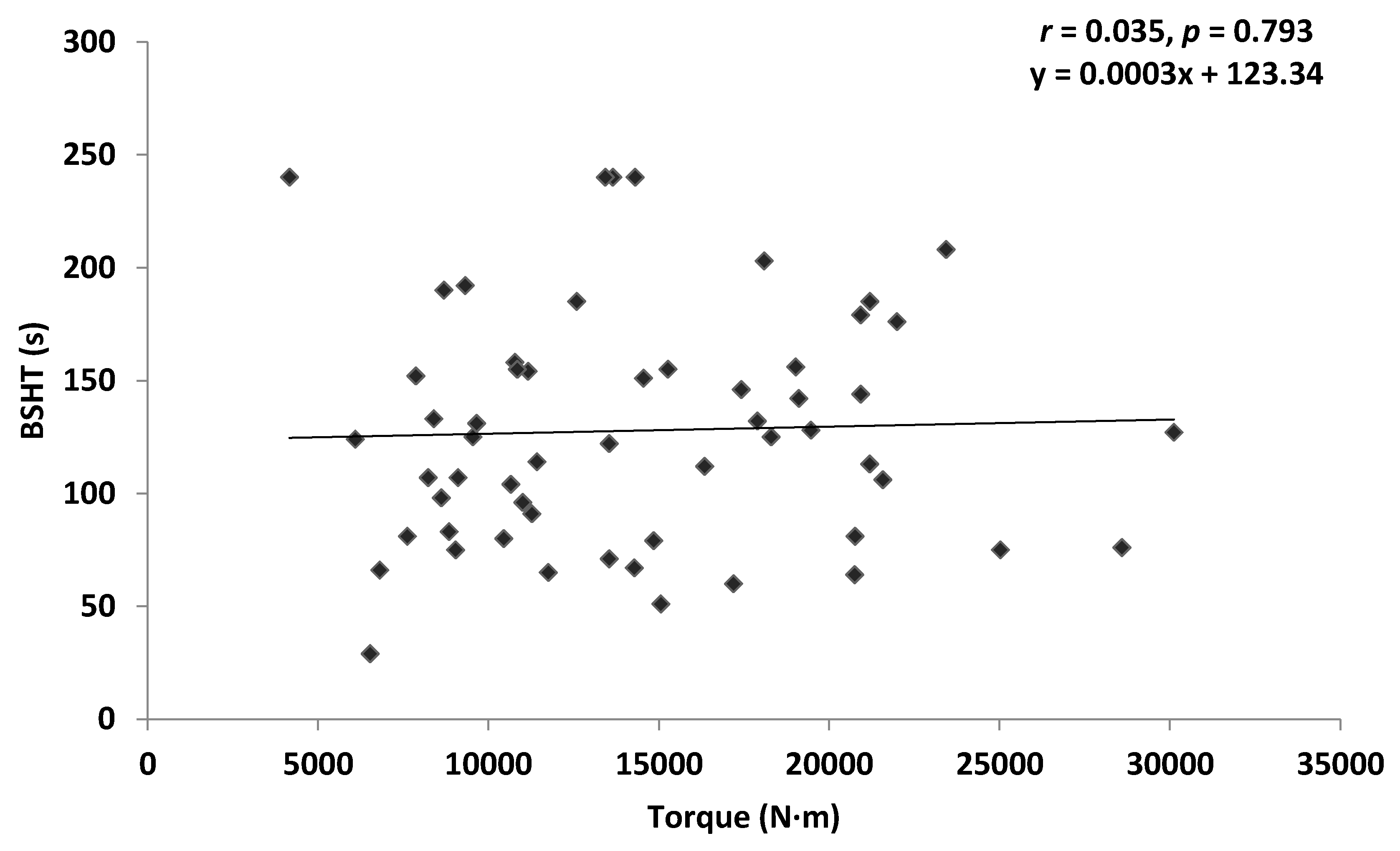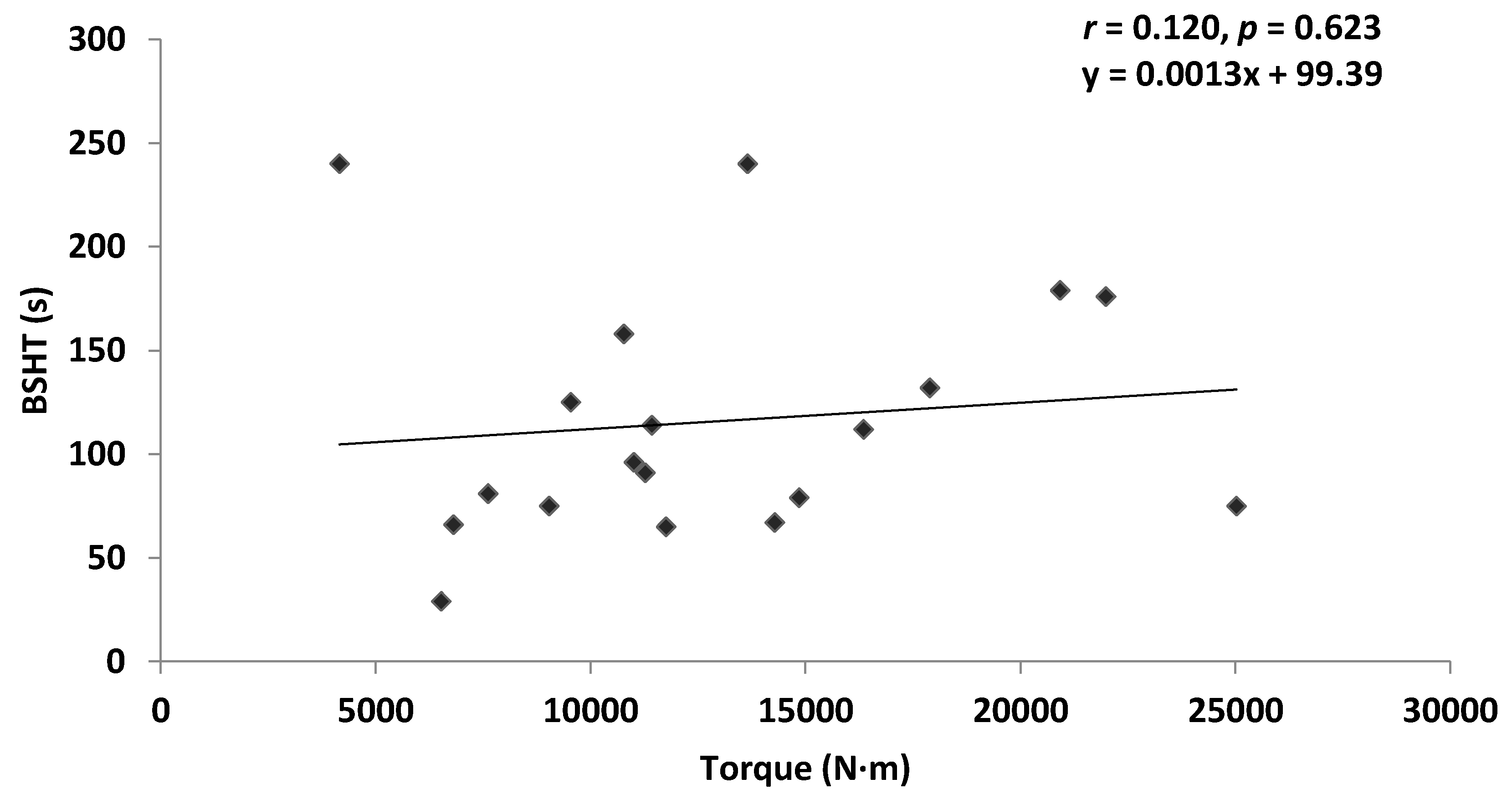 Pearson’s correlation revealed a non-significant very weak positive correlation between ILEX strength and TEX endurance in the combined group (r = 0.035, p = 0.793), and the chronic LBP group (r = 0.120, p = 0.623). A non-significant very weak negative correlation was found between ILEX strength and TEX endurance in the asymptomatic group (r = −0.060, p = 0.720). Figure 3, Figure 4 and Figure 5 present scatter plots of data for ILEX strength (SI) and TEX endurance (BSHT).