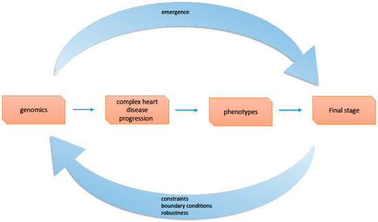 The emergent functional characteristics originate from a self-organized process of biological components structured in a “system” with hierarchical order and bottom-up causation. The universal phenomenon of emergence is extended to molecular and clinical medicine, and implicates pathology and progression of complex diseases. Systems biology approach of emergence, applied as systems medicine at the clinical level, improves our understanding for the sequence of molecular and biochemical events that take place in cardiac diseases. This approach facilitates also the practicing clinician to comprehend why clinical picture progressively is changing, as disease is adjusted to novel emergent properties. The hierarchical network and modular construction, in a ladder of biological progression, from genes to phenotypes, involves emergence of new properties in each step of the biological process. The emergent new properties generate malfunctioning biological processes which participate in disease progression. This concept of emergence was developed in biology in order to understand and explain the phenomenon of life [27,28]. In the past, many articles have been published describing the emergent biological status and its characteristics [29,30]. It seems that the phenomenon of emergence depends on multiple factors interacting non-linearly, while the emergent properties in many ways are unexpected and possess level characteristics. Furthermore, functional emergent properties in each level which are provoked by non-linear interaction of multiple parameters, lead to functional connection (relationship) between successive biological levels. The emergent properties in each higher level are related or generated from the underlying processes of the lower level. This way, the specific structure of each lower level will have some connection to the emergent properties of the next higher level but this relationship is not completely causal. It seems that other factors are required, not necessarily directly causal, to explain differentiation and independence of emergent properties at the higher level from properties of the lower level. Cardiac diseases are organized in a complex functional manner with capacity of adaptation to a variety of internal and external environments.