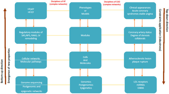 The two strategies are complementary exploring the complexity that characterizes the hierarchical structure of cardiac diseases. It is acknowledged that in the bottom-up direction most important is the emergence of novel properties not expected from the isolated function of individual components. In addition, along the top-down direction significant is the construction of phenotypes (models), modules and networks that are underlying the disease state. The top-down direction is approaching “biological generalizations without the need for a full understanding of all molecular properties from the bottom-up” direction [10]. In other words we can describe phenotypes or modules or networks of a disease without fully knowing or understanding all the biochemical interconnections that are taking place. We could consider the disease entity as a complex whole of discrete biological mechanisms with some specific components and tasks that differ from the acknowledged normal components and functions. Furthermore, the disease entity is viewed as a layered biological construction with linked levels of “abnormal” molecular or clinical states.