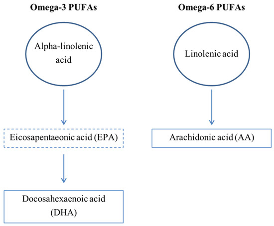 Like cholesterol, polyunsaturated fatty acids (PUFAs) are detectable in the peripheral circulation and have been linked to MDD. Phospholipids which form membranes are comprised of phosphate “heads”, glycerol and fatty acid “tails”. These PUFAs are either derived from linolenic acid (omega-6) or alpha-linolenic acid (omega-3; Figure 1). The most common omega-6 is arachidonic acid, whilst the most common omega-3 is docosahexaenoic acid (DHA), followed by its precursor eicosapentaenoic acid (EPA) [90]. DHA alone comprises 15%–20% of human brain lipid and reduction in this group has strong association to depression due to dysregulation of inflammatory responses, decreased antioxidant capacity and disordered neurotransmission [91]. DHA is the most abundant omega-3 fatty acid in the mammalian CNS, particularly during early developmental stages [92]. It is absent from foods of plant origin, with the richest dietary source being fatty fish [93]. Omega-6 PUFAs are generally pro-inflammatory, whose major detrimental effect is thought to be due to competitive inhibition of omega 3 PUFAs, indicating a protective effect of omega-3 PUFAs [90]. Both omega-3 and omega-6 PUFAs are essential compounds, meaning they can only be derived from diet (omega-6 is largely derived from plant oils, whilst omega-3 predominately comes from fish oils). That, coupled with the proof that differentiation and functioning of cultured brain cells requires alpha-linolenic acid, omega-3 and omega-6 PUFAs, makes the link between brain function and diet clearer [94].