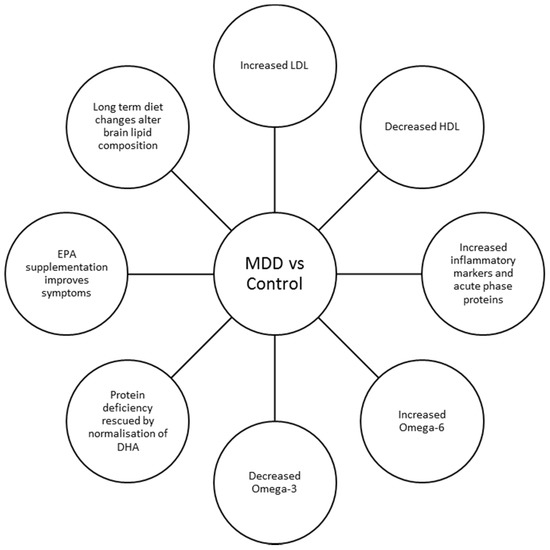 In addition to CVD, levels of cholesterol and cholesterol-containing molecules have been linked to MDD. Decreased total serum cholesterol is commonly observed in depressed patients suffering from MDD when compared to healthy controls [33,34,35]. Furthermore, a considerable body of research has demonstrated that MDD patients often exhibit a decrease in high-density lipoprotein, an increase in low-density lipoprotein and an increase in LDL/HDL ratio [21,34,36]. Interestingly, lack of remission from depressive symptoms is also associated with low levels of both total serum cholesterol and LDL cholesterol [37,38]. In addition to the observed association with differing HDL and LDL levels, the levels of constituent apolipoproteins have been associated with MDD [39]. A case-control study revealed that depressed patients had higher circulating levels of LDL and its apolipoprotein B (apoB, constituent of LDL), alongside lower levels of HDL and apolipoprotein A (apoA, constituent of HDL) when compared to healthy controls.