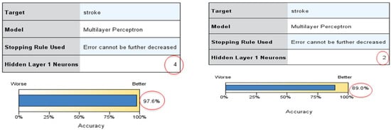 We set the chronic disease of stroke and heart attack as the target or dependent variables, and all other behavioral habits variables as the predictor/independent (input) variables. Neural network models were run separately for each dependent variable. The six most important predictors for each of the dependent variables were selected to run the models again. The data had 2907 rows for analysis. Figure 1 shows the best model for predicting stroke, with the highest accuracy of 97.6%. The best fit model has one input layer, one hidden layer with four nodes, and one output layer. The partition rate of 50–50 was used.
