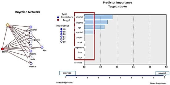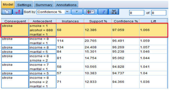 The threshold (minimum confidence) was set to 94% in keeping with the high accuracy requirement for healthcare analytics. There were 68 people (12.386% of all records) who were married, did not drink in the past 30 days, and had smoked at least 100 cigarettes in their entire life. Of this group, 97.059% were diagnosed with a stroke. There were 114 married people whose income is more than $75,000. Of this group, 96.5% were diagnosed with a stroke. There were 134 people whose income is more than $75,000. Of this group, 96.4% were diagnosed with a stroke. The important predictors for stroke using association are marital status, alcohol consumption, smoking, and income. The results are shown in Figure 2.