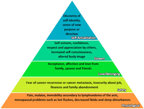 The well-being of a cancer patient is determined by how well her physical, social, psychological, emotional, and spiritual needs are being met. These needs are also mirrored in the Maslow’s hierarchy of needs, a motivational theory in psychology []. The figure below (Figure 1) is modified based on Maslow’s original framework [] to suit the context of breast cancer patients, based on concerns raised by Institute of Medicine(US) (2008), Schmid-Büchi, S. et al. (2008), NCCS Breast Cancer Surivorship Programme (2016) [,,].