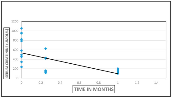 Garki Hospital, Abuja, Nigeria is a rejuvenated PPP medical facility in the nation’s capital that started renal transplantation in late 2013. We completed a retrospective analysis of all available medical records of patients who underwent renal transplantation at the center between 2013 and 2016 [18]. There were 10 renal transplant recipients, 5 males and 5 females, with a median age of 48 (19–64) years, all on maintenance hemodialysis for a median period of 39 (1–192) months before renal transplantation (Figure 1). All renal allografts were living kidney allografts—2/10 were living-related and 8/10 were living-unrelated donors including two wives. Hypertension (8/10) was the most common cause of ESRD. Cross-match testing was performed at Hammersmith Hospital, London. Donor nephrectomies were by the finger-assisted technique. There was “bundling” of renal transplantation procedures—two renal transplantation procedures were performed on same day during three different periods to maximize the utilization of transplant manpower and resources. Induction immunosuppression used Thymoglobulin/Methyl Prednisone and maintenance immunosuppression utilized Tacrolimus/Mycophenolate Mofetil/Prednisone. Hospital LOS was 23 (12–34) days. Immediate renal transplant complications were acute pulmonary edema (2), peri-allograft hematoma (2), and wound dehiscence (1). The results of renal transplantation were excellent by serum creatinine assays (Figure 2). As at the end of 2016, acute rejection was absent in 7/10, probable in one and data was not available in another two renal transplant recipients [18]. Four patients died, and clinical information on the cause of death is lacking. The latest mean serum creatinine in the six surviving renal transplant recipients is 1.38 mg/dL at a median of 5 (1–13) months post-transplantation [18].