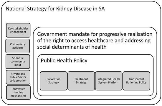 A national strategy for the management of CKD needs to account for challenges both at macro level and at the clinic level. In order to address these challenges, a number of groups need to engage both at the national and public health policy levels. These stakeholders include civil society, the scientific community, the government, and the private health sector. Engagement would need to address systemic challenges in providing CKD management, such as facilitating the progressive realisation of the right to access health care, and addressing the social determinants of health. At a policy level, prevention and treatment strategies should go hand-in-hand, implemented in an integrated health system, and guided by a transparent rationing policy. All decisions and discussions would need to critically explore the scope for instituting novel funding strategies to expand access.