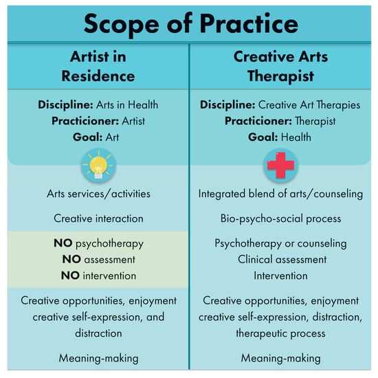 Collaboration among creative arts therapists and artists in residence working in healthcare can enhance the interprofessional team by providing a spectrum across which the arts may be utilized for patient care and comfort. When both creative arts therapists and artists are available on the clinical team, a wider and more comprehensive range of creative tools, approaches and services are available to patients, family members, and the interprofessional team. To optimize engagement of these offerings, education may be provided to the interprofessional team as to what specific modalities are available to patients and in what circumstances each modality best fits. Figure 1 below, adapted from Imus [65], highlights distinctions in scope of practice between artists and creative arts therapists in healthcare.