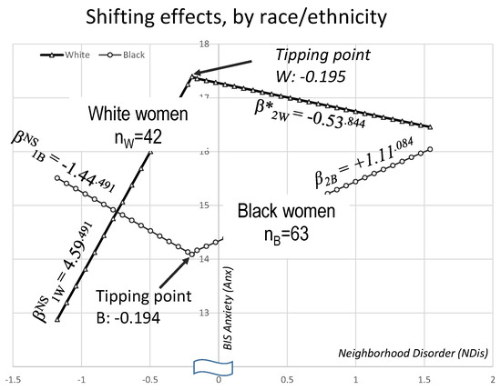 We found that more nuanced health disparity (HD) conclusions can be reached by investigating differential effects on health by racial/ethnic (R/E) groups using a segmented (piecewise) regression method that allows the linear effects to switch/change. In particular, we found that the effect of neighborhood disorder, a measure of adverse environmental conditions, on anxiety operates differently in white than in Black young women, confirming prior findings of differential associations between neighborhood conditions in different R/E groups [39]. It appears that Black and white women handle challenging neighborhood conditions differently, considering how such conditions impact their mental health, anxiety in particular. We note that at about one-fifth of a standard deviation in neighborhood disorder below its mean, something happens that changes the dynamic of the neighborhood disorder → anxiety relationship in both white and Black young women, although the change is markedly different in the two groups.
