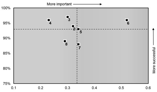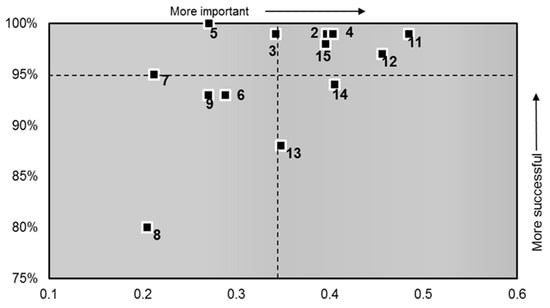 The results suggest that questions 2, 4, 11, 12, 13, 14 and 15 have the highest patient priority when measured against their perceived involvement in their care (Figure 2).