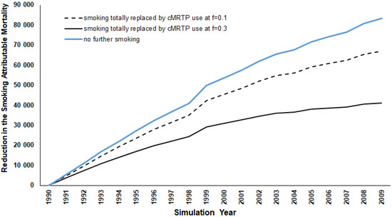 As in the first scenario, the initial years show a marginal reduction in SADs, between 3726 (f-value = 0.30) and 4907 (f-value = 0.10) in 1991 (see Figure 2). However, by the end of the period, the introduction of the cMRTP resulted in a cumulative reduction in SADs between 516,944 and 780,433 (55% to 83% of the results seen for no further smoking).