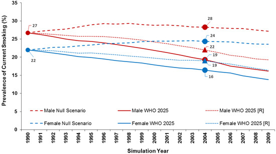 In the WHO 2025 Projection scenario (14% reduction in 15 years), the transition probabilities used produced smoking prevalence of 21.3% in males and 18.5% in females in 2005. These were equivalent to 20.2% and 15.7% reductions, respectively, somewhat greater than the 14% reduction they were designed to produce. Here, there was a cumulative total reduction of 111,102 fewer SADs (69,042 in males and 42,060 in females). Figure 3 illustrates the trends in smoking prevalence in the two WHO scenarios as compared to the null scenario.