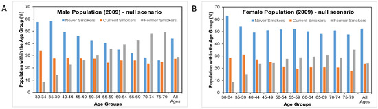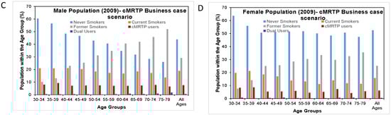 Distribution of smoking patterns by age and sex in 2009 in the null scenario and in the cMRTP uptake case scenario. (A) is the distribution of smoking patterns by age in the male population under the null scenario while (C) is the same male population under the Business case scenario. (B) is the distribution of smoking patterns by age in the female population under the null scenario while (D) is the same female population under the Business case scenario.