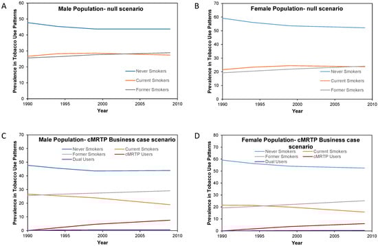 Change in smoking prevalence patterns by sex over the period 1990 to 2009 in the null scenario and in the cMRTP uptake case scenario by sex. (A) is the change in smoking prevalence over time in the male population under the null scenario while (C) is the change in smoking prevalence for the same male population under the Business case scenario. (B) is the change in smoking prevalence over time in the female population under the null scenario while (D) is the change in smoking prevalence for the same female population under the Business case scenario.