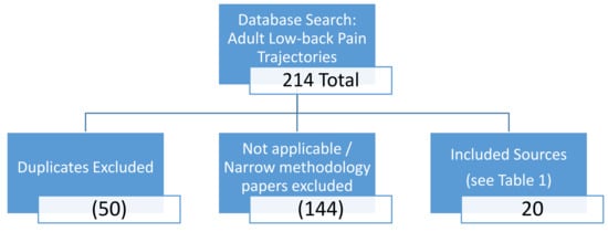 The purpose of the present investigation was to review the various trajectories that have been delineated by different clinical research groups, focusing on low-back pain (LBP) for a number of important reasons. First, as highlighted in the IOM report “Relieving Pain in America” [8], musculoskeletal pain is the most common single type of chronic pain; chronic LBP (CLBP) is the most prevalent in this category. Indeed, the economic burden of LBP is quite large, and continues to grow in the US. Total healthcare costs for LBP, combining direct and indirect costs, have been estimated to amount to roughly $100 billion annually [8,9]. Moreover, as reviewed by Luo and colleagues [10], approximately 80% of Americans will experience at least one episode of back pain during their lifetimes, and 15–20% report back pain at some time in a one-year period. Kongsted and colleagues [11] point out that, previously, LBP was categorized as acute or chronic, where acute sufferers experienced one or more events of unrelated pain or a continuous pain state.