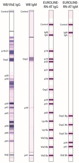 - Goettner, G.; Schulte-Spechtel, U.; Hillermann, R.; Liegl, G.; Wilske, B.; Fingerle, V. Improvement of Lyme borreliosis serodiagnosis by a newly developed recombinant immunoglobulin G (IgG) and IgM line immunoblot assay and addition of VlsE and DbpA homologues. J. Clin. Microbiol. 2005, 43, 3602–3609. [Google Scholar] [CrossRef] [PubMed]