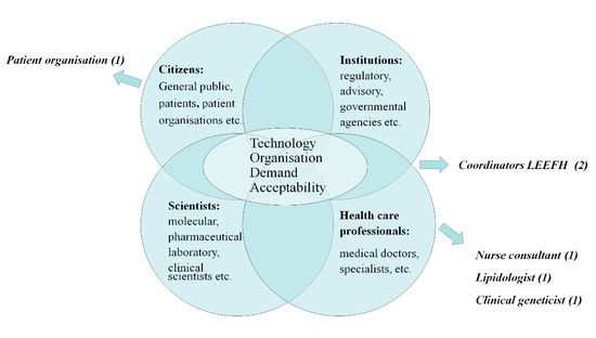 The stakeholders were identified based on a conceptual model for a sociotechnical analysis. In a sociotechnical analysis the roles and arguments of different actors or stakeholders in a network are studied to understand how an innovation, such as genetic testing, becomes part of, and shapes, a new healthcare practice [18,19]. In this process, also, the conditions for use and capacities of a technology become more clearly defined (co-evolution of technology and social-ethical context). In this model, the sources of dynamics may stem from various domains, requiring stakeholders in other domains to adapt their practices. Technological innovation in the scientific domain, for instance, may challenge current practice. New findings or changes, in demand by public and patients, may require healthcare professionals to adapt the organization of services. Also, evaluation of acceptability of procedures by regulatory, advisory, and governmental agencies may provoke changes in healthcare. In our analysis, we will use this conceptual model to describe how stakeholders in The Netherlands are realigning their practices in genetic testing and informing family members in a changing healthcare landscape, after the ending of the FH screening program in 2014. In this case, changes in technology were not the source of dynamics.