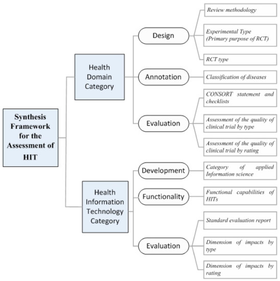 In another work, described in [26], HITs are classified by study design, care setting, health IT components, functions included in the meaningful-use criteria, and finally addressed outcomes. Outcomes are classified by their type (e.g., access to care, preventive care, care process, effectiveness, satisfaction, safety, etc.) and their rate (i.e., positive, mixed positive, neutral and negative).