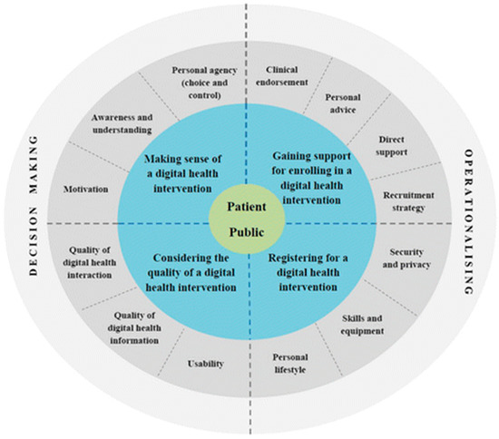 In a systematic review of 19 studies, key factors contributing to successful engagement and recruitment to digital health interventions (DHIs) were identified [15]. These included “engagement strategies” such as indirect advertising (e.g., online, electronic, and print media) and direct personal contact; and “recruitment strategies” such as automatic, electronic, paper-based, assisted (health professional creates an account) or via the phone. The findings were used to develop the “Digital health engagement model (DIEGO)” (see Figure 1), which outlines four processes for improving user engagement: (1) “Making sense of the DHI”, including understanding the recruitment message, awareness about the benefits; and perceived control and choice in use; (2) “Considering the quality of the DHI”, including the perceived quality of the intervention, trust (openness and honesty), the quality of information given, and the level of complexity for use (whether interactions were automated and integrated); (3) “Gaining support for enrolling in the DHI”, including recommendations from trusted sources and clinical endorsement; and (4) “Registering for a DHI”, including factors such as digital literacy, security concerns, and internet access.