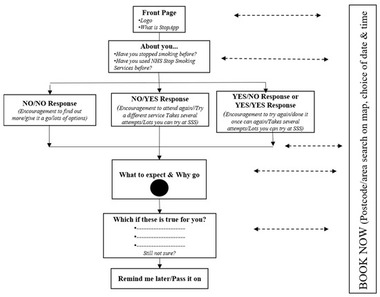 In order for StopApp to enable instant booking at services, it was necessary to integrate StopApp with the existing service booking systems used locally in Warwickshire (and increasingly nationally). This is offered by two systems, for pharmacies “Pharmoutcomes”, and GPs “Outcomes4Health”, created by Pinnacle Health Ltd. To create a seamless user experience, users choose an available appointment within StopApp, and in order to book this, their name and mobile number are exported into Pinnacle’s system to register the booking on an online calendar visible to staff in the services. This enables staff to contact the user in the unlikely event of staff illness/the need to rearrange an appointment. Data is not stored on StopApp, therefore ensuring security and information governance requirements are met. A digital calendar system did not exist within the pinnacle system used by services, therefore, StopApp commissioned Pinnacle Healthcare Ltd. to create this within their existing system. This was achieved with input from the lead commissioner for services and tobacco control within the local public health department. Feedback from several Stop Smoking Services was also sought to ensure usability for the advisors receiving the bookings. Based on this feedback, additional functions were added, and existing tools amended accordingly. For example, advisors requested that clinic times could be entered as a recurring (rule) or standalone event for ease, and that the tabs were relabeled for clarity. Back-end functionality testing was conducted to ensure the functioning of the booking system, and that confirmation and reminder to attend messages were generated. StopApp was viewed on tablets, android/iPhone, and desktop computers to test viewing compatibility across platforms. The basic structure of StopApp content and navigation is illustrated in Figure 2.