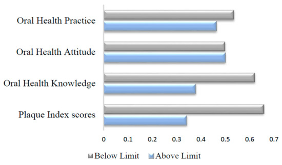 Distribution of scores of oral health determinant factors based on cut-off value.