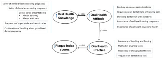 This study also showed low practice levels in more than half of the participants (54%). Moreover, the plaque index scores, which is an indicator of oral hygiene and a proxy for gingival health [38], was also high in about 66% of participants, suggesting a low level of oral hygiene among the pregnant women. This finding was in line with results from a study by Bressane et al., 2011; reporting inadequate oral health behaviors during pregnancy [39]. Figure 2 summarizes the correlation between these oral health determinant factors. This study also suggested that, while 73.2% of the participants perceived their oral health status to be poor or moderate, they did not consider oral health care as an urgent need and preferred delaying the dental visit until after delivery.