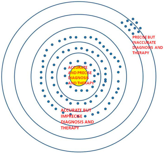 While the above definitions allow us to assume that precision medicine is focused on meeting patients’ requirements accurately, we need to review the scientific nature of accuracy, precision and their relationship with each other to put things in perspective. This is essential toward optimizing patient requirements and outcomes, minimizing damage to the healthcare ecosystem by reducing under-overdiagnosis and therapy. To quote from Thomas (2014), “The healthcare ‘system’ is now better understood as an ‘ecosystem’ of interconnected stakeholders, each one charged with a mission to improve the quality of care while lowering its cost. To ensure patient safety and quality care while realizing savings, these stakeholders are building new relationships—often outside the four walls of the hospital” [3].