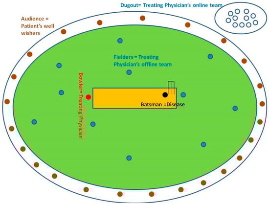 We draw below an analogy of our blended ecosystem with a cricket match (Figure 2), where the bowler is the treating physician, along with the rest of the fielders as a part of the treating team. The dugout is the online team sending inputs to the bowler, also known as, the offline treating physician team for taking the wicket of that batsman, also known as, the disease.