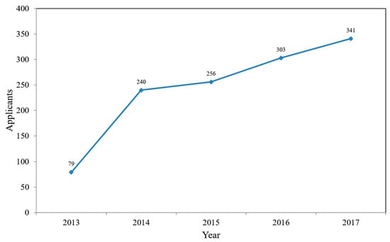 Growth of the number of postpartum home visiting service applicants from 2013 to 2017.