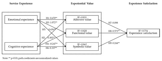 Total variances (R2 values) explained by affective value, functional value, symbolic value, and satisfaction were 0.831, 0.828, 0.862, and 0.754, respectively. Thus, the model had a good explanatory power.
