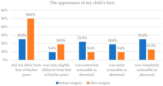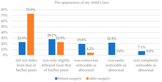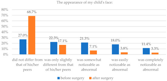 - The appearance of my child’s face before surgery: did not differ from that of his/her peers; was only slightly different from that of his/her peers; was somewhat noticeable as abnormal; was easily noticeable as abnormal; was completely noticeable as abnormal
