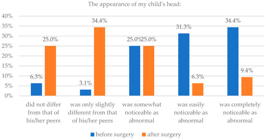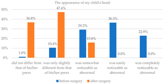 Seventy-six percent of parents claimed that the appearance of their child’s head after surgery did not differ or differed only slightly from that of their peers. 58% claimed that before surgery, the irregular head was noticeable by all or most people. Analysis showed a statistically significant difference between the before and after (p = 0.015).