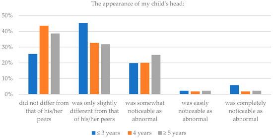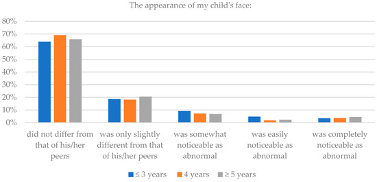 Seventy percent of parents of children three years of age and less thought that after surgery the appearance of their child’s head did not differ or differed only slightly from that of his/her peers, while 8.1% thought that it differed greatly. Eighty-three percent of parents thought that the appearance of their child’s face did not differ or differed only slightly from that of his/her peers, while 8.2% thought that it differed greatly. For parents of children four years, similar positive assessment were 76.3% and 87.3%, respectively for the head and the face assessment; and for parents of children 5 years and more, 70.4% and 86.4%, respectively. Additionally, in this case, there were no statistically significant differences within these subgroups (p = 0.145), which again suggests a consistent aesthetic effect of reconstruction surgery. Details are presented in Table 4 and Figure 7 and Figure 8.