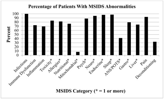 - Mitochondrial Dysfunction (defined by those who had positive responses to the following mitochondrial support supplements: ATP fuel (NT Factors, i.e., glycosylated phospholipids), Coenzyme Q10 (CoQ10), acetyl-l-carnitine, d-ribose): 15 (7.5%) had mitochondrial dysfunction.