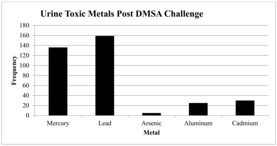 - Heavy Metals: 169/185 (84.5%) had one or more elevated heavy metals using a 6-h urine DMSA challenge: