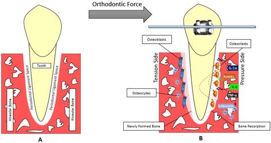 Bone change associated with both pressure and tension areas in OTM involve a complicated communication between three main tissues: alveolar bone, periodontal ligament, cementum (Figure 1) [48]. The signaling pathways, chemical mediators and signaling cytokines useful in alveolar bone remodeling needed for OTM are the same as those in skeletal bone remodeling. The expression of PDL cytokines and chemical mediators has been reported to be significantly altered during OTM. The levels of IL-1α, IL-1β, IL-6, IL-10, IL-17, IL-33 and TNFα are significantly increased shortly after force application, except IL-6 that remains high after 12 days then it starts to decrease to its normal levels after 3 weeks of force application [49,50,51,52,53,54,55,56,57,58].