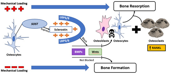 Sclerostin is a negative osteoblast regulator. Sclerostins open the door modulating bone turnover through signaling agents which regulate bone homeostasis. The regulation of osteocyte-specific genes plays a major role in the process of bone remodeling common to both skeletal and alveolar bone [17,18]. Using their processes, osteocytes can communicate with cells on the bone surface and in the bone marrow [19,20]. Sclerostin, one of the proteins by which osteocytes regulate the function and number of the cells responsible for remodeling, is the product of the SOST gene [21,22]. Investigations of sclerostin deprived systems show enhanced bone formation. Altered sclerostin expression and restored bone formation after treatment with anti-sclerostin antibody in postmenopausal women and animal models suggest that sclerostin inhibition may be a viable approach for developing novel anabolic agents for diseases characterized by bone loss [23,24,25,26,27]. Sclerostin antibody (Scl-Ab) is receiving increasing attention as a bone-forming agent, as supported by studies in animals in which significant increases in bone volume and whole bone mechanical strength have been noted and in clinical trials showing increases in systemic bone formation markers and bone mineral density (BMD) [27,28,29,30]. The use of Scl-Ab leads to an increase in both osteoblast activity and osteoblast number, resulting in enhanced bone formation [31,32]. Studies with Scl-Ab treatment have demonstrated that osteoid synthesis and deposition appear to be upregulated globally as assessed by serum markers including P1NP (serum type 1 pro-collagen C-terminal/N-terminal) and osteocalcin [33]. Sclerostin secreted exclusively by osteocytes, is a glycoprotein that binds low-density lipoprotein receptor-related protein 5 and blocks the Wnt signaling pathway [34]. It suppresses osteoblastogenesis and reduces the viability of osteoblasts and osteocytes, leading to unbalanced bone turnover in favor of bone resorption not only by antagonizing Wnt but also by blocking bone morphogenetic protein signaling, both are essential for the maintenance of osteoblastogenesis [35,36,37]. Accordingly, it was shown that mechanical stimulation in vivo reduced the osteocytic sclerostin expression [38]. Also, it is possible that osteocyte death is a signal for bone formation because the level of sclerostin would decrease. Sclerostin levels are increased in mechanical unloading, aging and menopause, whereas they are decreased in hyperparathyroidism [39,40].