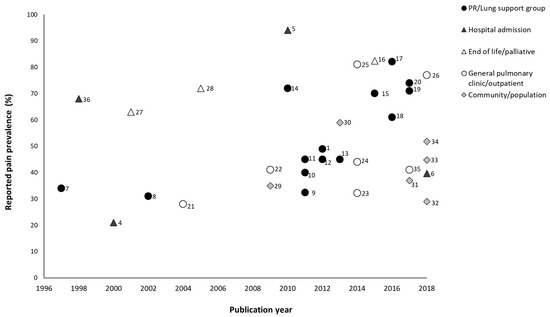 - van Dam van Isselt, E.F.; Groenewegen-Sipkema, K.H.; Spruit-van Eijk, M.; Chavannes, N.H.; de Waal, M.W.M.; Janssen, D.J.A.; Achterberg, W.P. Pain in patients with COPD: A systematic review and meta-analysis. BMJ Open 2014, 4. [Google Scholar] [CrossRef]